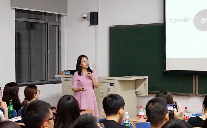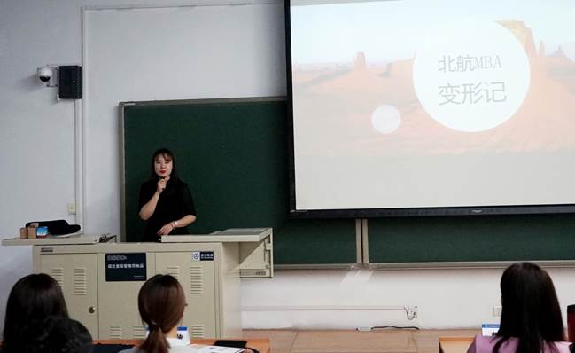 首先,校友车涵凝以“MBA的收获-北航MBA变形记”为主题进行了一场别出心裁的分享。从“人”“面”“桃”“花”四个方面讲述自己从备考到入学北航再到毕业之后的巨大变化,并分享了自己在MBA期间的课程学习和丰富的校园生活以及通过这段学习旅程给自己带来的巨大收获。其中“人”是指,真正开心的事情是人们通过努力得到的成果;“面”是指不要高估一年的成长,也不要低估五年的成长;“桃”同音“逃 ”,是指这个时代最可怕的毁灭方式,就是拒绝成长,成长即是收获;“花”指的是身份共识是社会人的依靠,并且提出观点:MBA时代+后MBA时代=学习时代+合作时代。最后,车涵凝用“以青春的名义,在北航召唤与梦想同行的你”,欢迎报考2020级北航MBA考生们,整个分享在幽默诙谐又耐人思考的过程中结束。