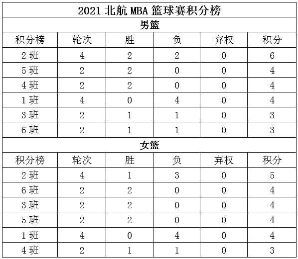 经过两天的比赛,男篮赛场上2班、4班、5班、6班取得了1胜的好成绩;女篮赛场上3班、4班、5班、6班取得了1胜的好成绩。各班最新积分排名新鲜出炉!