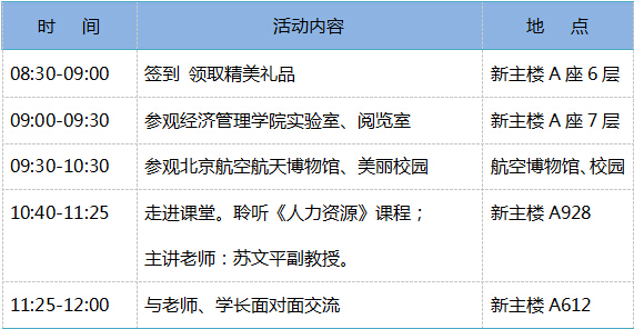 为了让广大考生更好的了解北航,了解MBA项目,零距离的和北航老师、同学们做更进一步的交流,我们为您精心安排了校园开放日。届时,MBA中心主任将亲临现场,针对项目进行全面、详细的介绍,您可了解到最新招生政策、提前面试安排。我们还将邀请校友作为招生宣传大使,为大家介绍北航的课堂特色和师资力量。