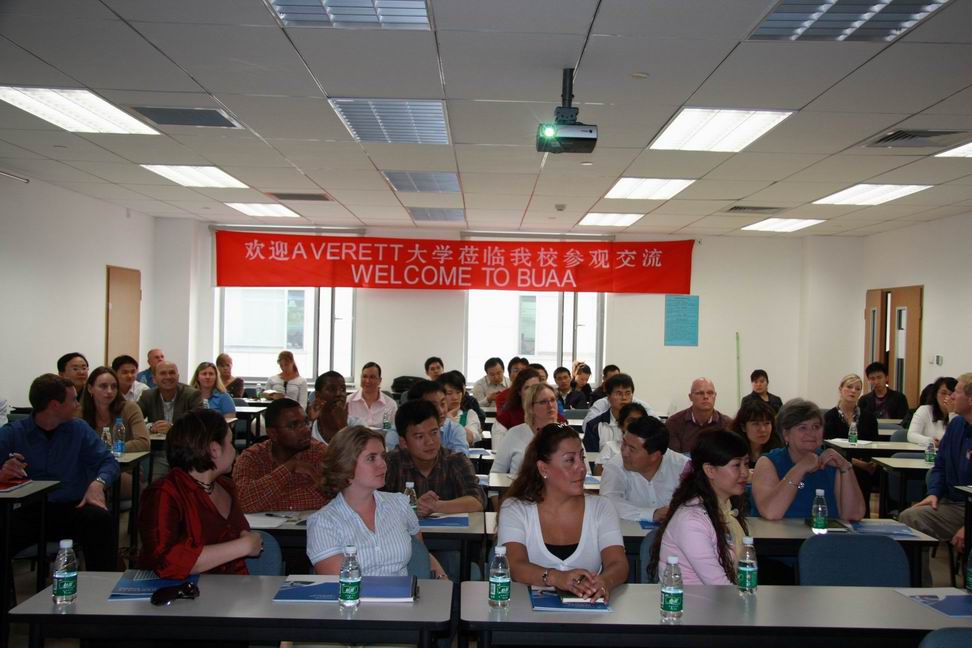 2008年10月21日下午,由Dr. Wally Saunders领队的Averett University 一行30人到我院参观访问,并与我院MBA学生进行了零距离互动。Averett University 一行30人,除领队外均是在读或者刚刚毕业的MBA学生,他们有着丰富的管理经验和职场经验,此行是他们第一次到中国,第一次到北京。之所以选择北航作为中国之行的第一站,正是倾慕于北航在航空航天领域的突出成就以及扎根于此土壤而发展的北航MBA的独有魅力。