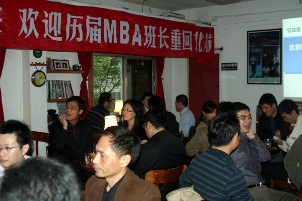 絮语昔日同窗事,喜话今宵聚首情。2009年4月18日傍晚,位于北航篮球场东侧的雕刻时光咖啡馆二搂内一片谈笑风生、处处暖意融融,北航第四届MBA历届班长、主席交流会在此顺利召开。本届MBA历届班长、主席交流会采用了主题沙龙的轻松座谈方式,改变了以往召开会议的做法。北航MBA教育中心主任苏文平副教授、张新华老师,北航校友企业家协会副秘书长吕泽铭先生等与历届北航MBA班长、主席抚今追昔、亲切谈心,共同为北航MBA辉煌新篇章的再叙献计献策。刚从北美回京的北航校友总会理事兼秘书长、欧美同学会理事、留美同学会副会长周自强教授莅临本次沙龙,受到了所有在场的老师、校友及同学们的热烈欢迎。交流会由第十届MBA联合会副主席季锦萍同学主持。