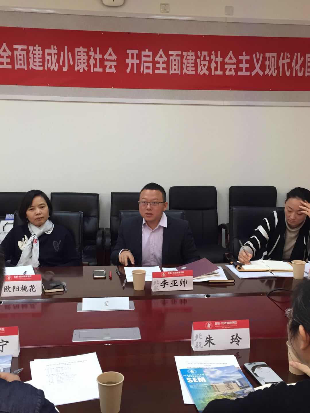 李亚帅主任对华南理工大学工商管理学院各位老师的到来表示欢迎,并简要介绍了北航MBA项目发展情况;石岚老师介绍了MBA课程教学与论文答辩管理情况;欧阳桃花教授介绍了案例教学与案例论文的撰写,提出论文要注重创新性,研究要来源于实践。与会人员围绕MBA课程设置、国际化建设、案例教学、招生、学生工作进行了深入讨论和交流。