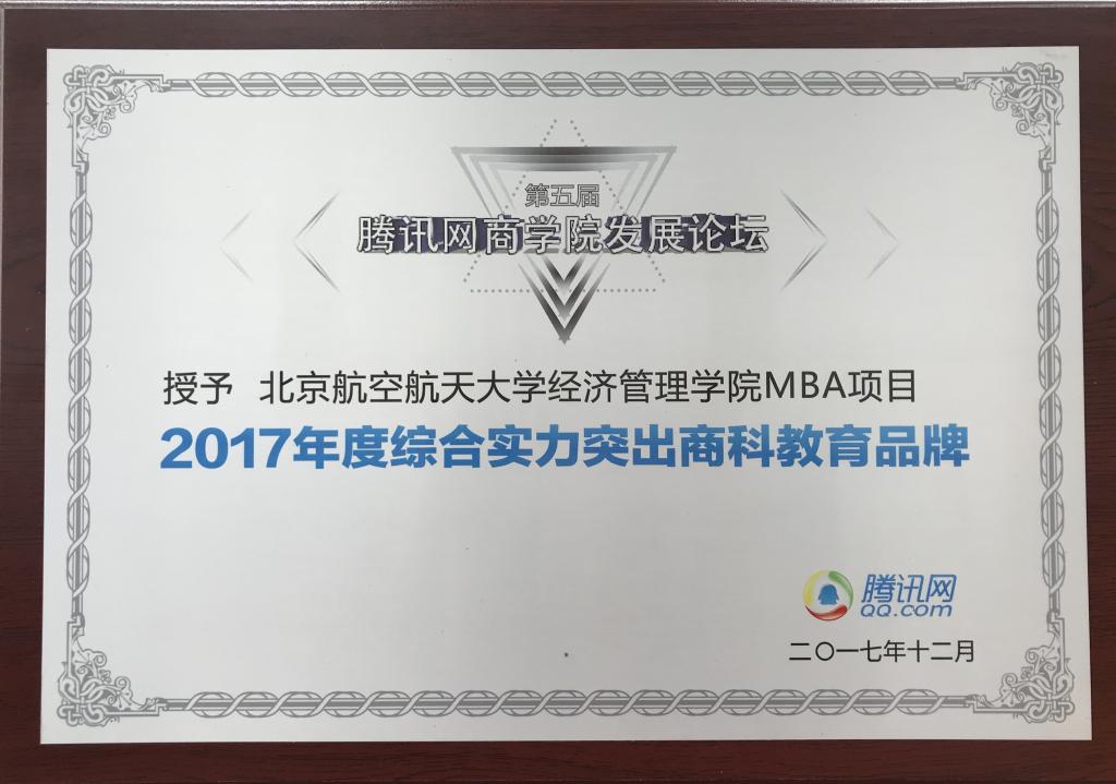 2017年12月13日,北航MBA教育中心应邀参加腾讯网主办的第五届腾讯网商学院发展论坛,此次论坛以“双一流商科思辨,智启菁英未来”为主题,探讨了新时代,大数据技术助力教育变革,全球视野下“双一流”建设。论坛不仅倾听了商学院院长们的智慧声音,分享了管理教育经验、心得,更是共同见证了商科教育的优秀力量和学习榜样。汇聚着中国网络用户声音的腾讯网评选出了杰出精英、榜样院校和校友团体,北航MBA荣获“2017年度综合实力突出商科教育品牌”。